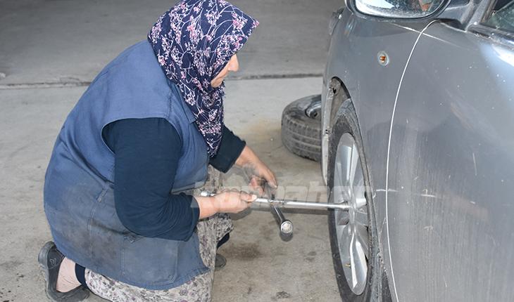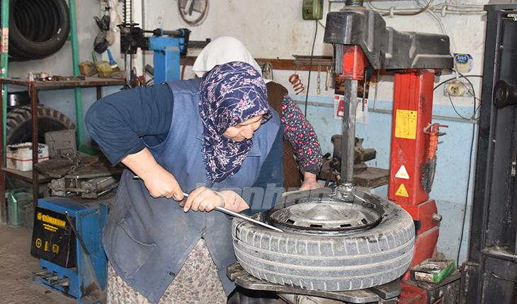 Afyonkarahisar'ın Sandıklı ilçesinde, askere giden oğlunun iş yerinin kapanmaması için başladığı lastik tamirciliğini yıllardır başarıyla sürdüren Vesile Akın'ın çırağı olan gelini de mesleği eline aldı.